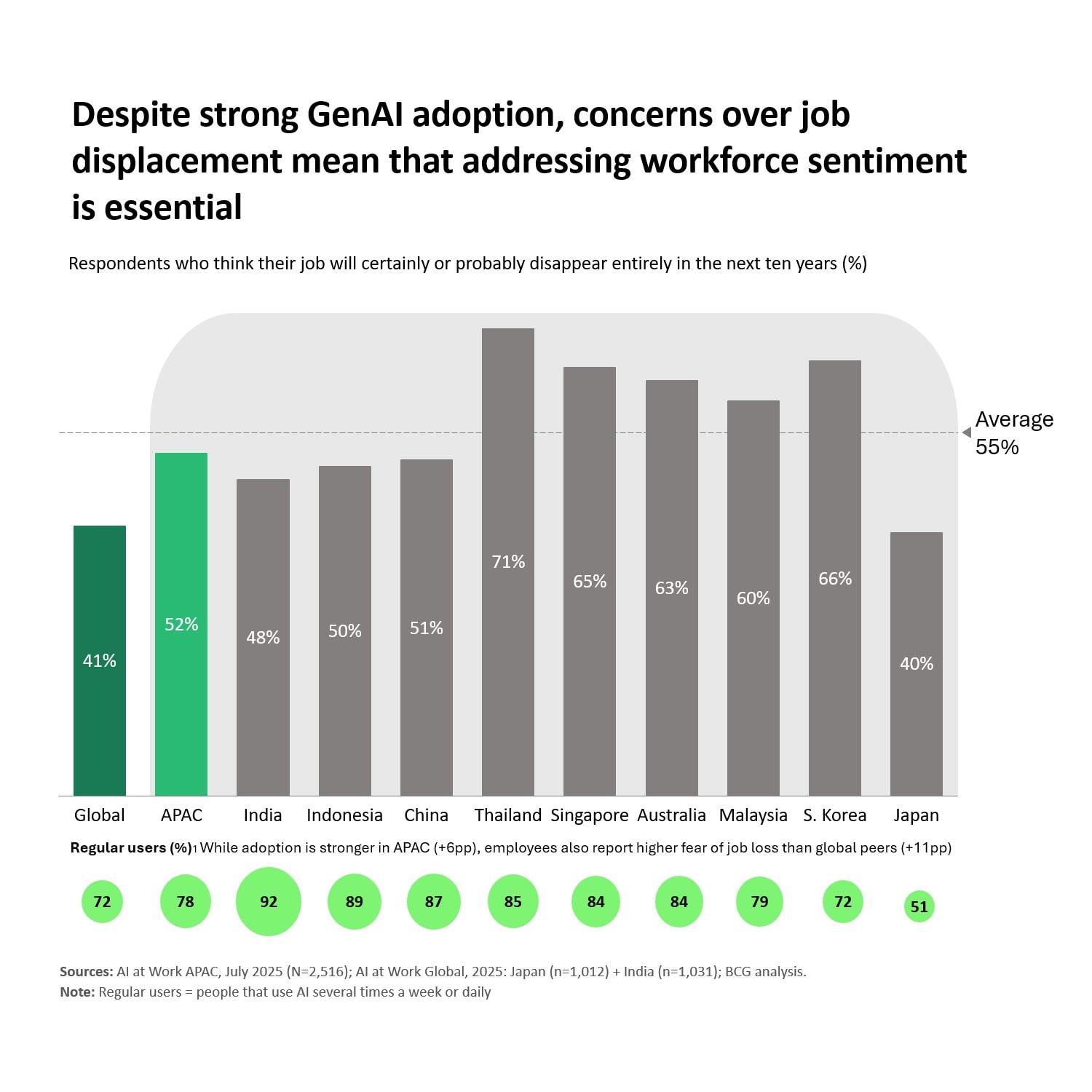 Despite this, only a third of these workers feel supported by leadership as the effects of generative AI begin to reshape workplaces. Fear of job loss is a key barrier. The report found that 65 per cent of respondents in Singapore believe their jobs will certainly or probably disappear within the next 10 years, compared to the global average of 55 per cent.
