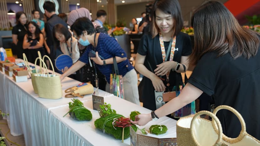 Once used to make slippers and household ware adorned with ethnic motifs, huangcao is now fashioned into contemporary items such as cup sleeves, coasters, handbags and souvenirs. At the exhibition, straw bags emblazoned with “I love Singapore” were among the highlights.