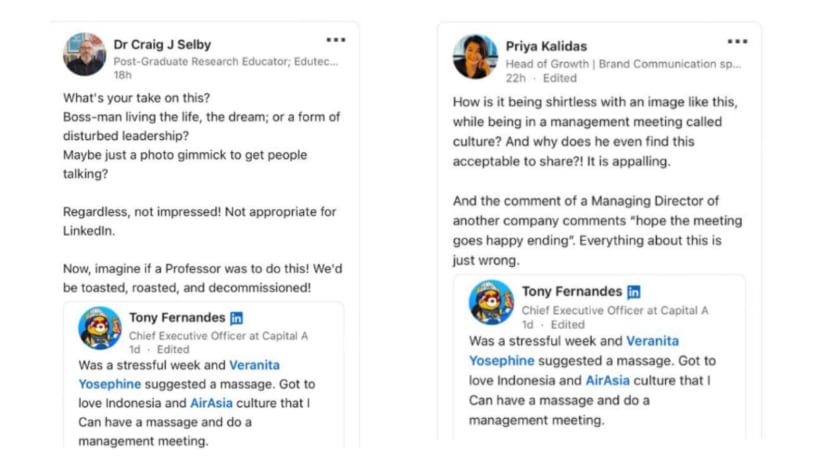 In a LinkedIn post on Monday (Oct 16), the low-cost airline boss posted a picture of himself, shirtless and sitting down, while a woman massages his left shoulder.
