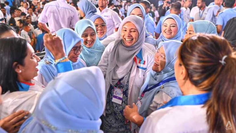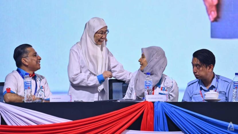 Malaysia Prime Minister Anwar Ibrahim speaks to his daughter Nurul Izzah at the 18th PKR National Congress at Persada International Congress in Johor Bahru, Johor, on May 24, 2025. (Photo: CNA/Zamzahuri Abas)
