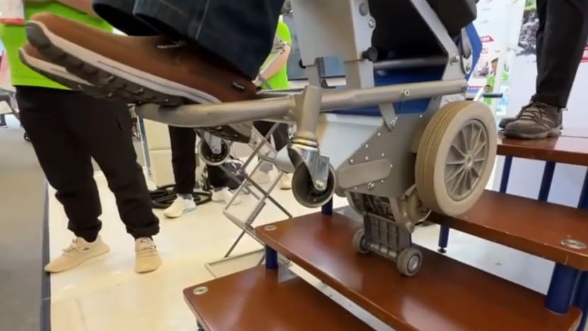 Another exhibitor showcased an advanced wheelchair that allows caregivers to manoeuvre it up the stairs while the user is comfortably seated.
