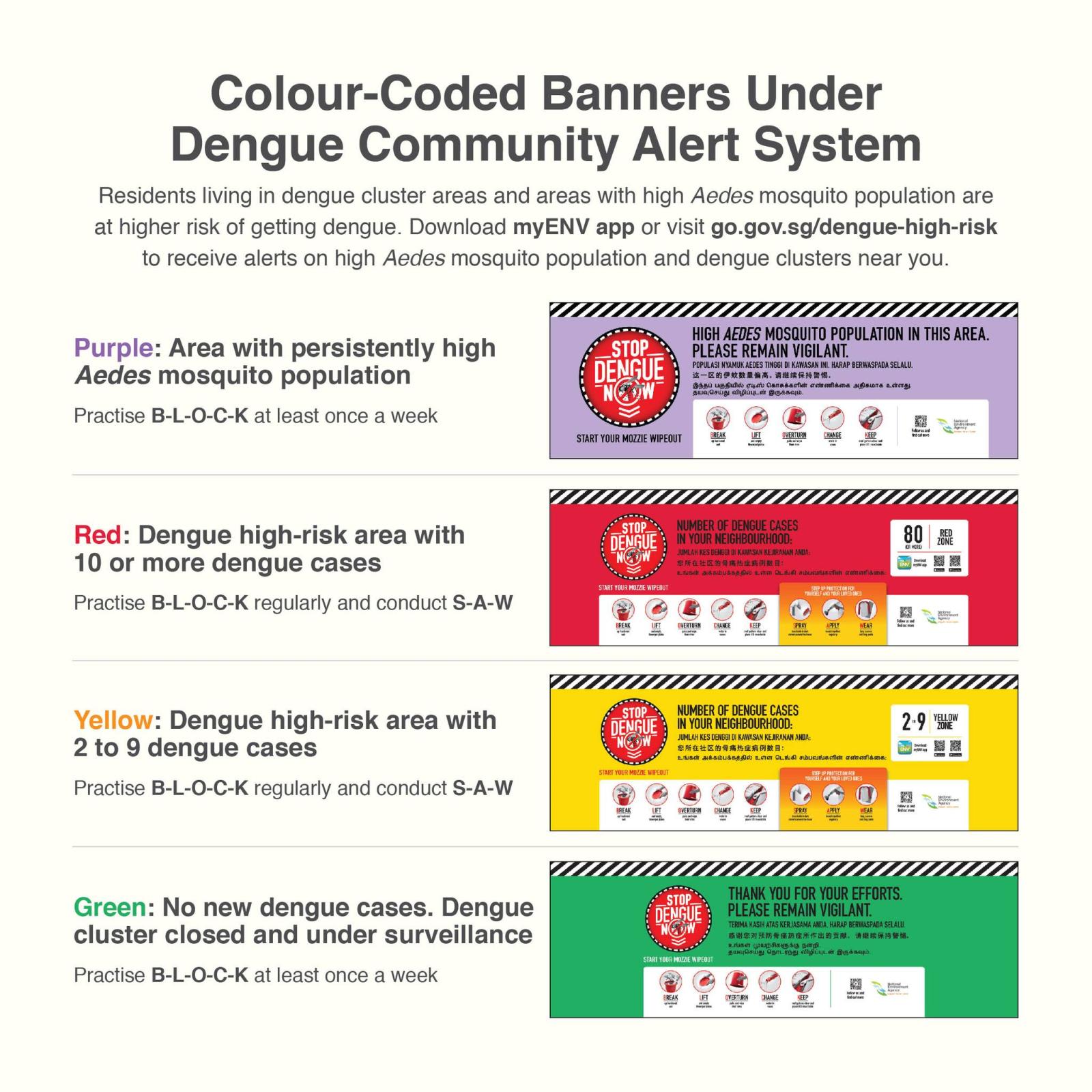 NEA also has a Dengue Community Alert System where colour-coded banners inform residents about the risk level in their locality. In 2022, the agency launched a new purple banner for areas with persistently high Aedes aegypti mosquito population.