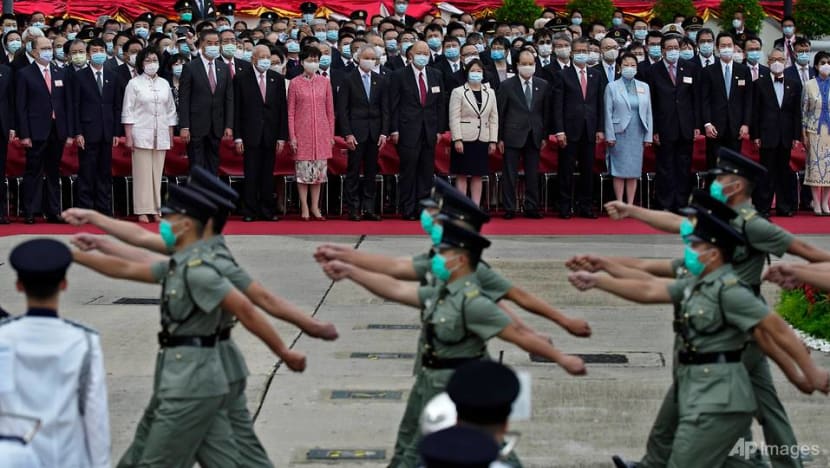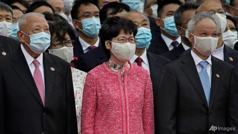 Earlier in the day, Hong Kong leader Carrie Lam attended a flag raising ceremony with other senior Hong Kong and mainland officials in an exhibition centre surrounded by police and security barriers.