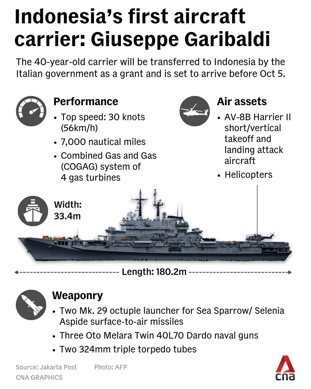 Jakarta recently announced it would acquire the Giuseppe Garibaldi aircraft carrier in the form of a grant from the Italian government. The decommissioned vessel, which served the Italian Navy from 1985 until 2024, is expected to arrive ahead of the Indonesian National Armed Forces anniversary on Oct 5.