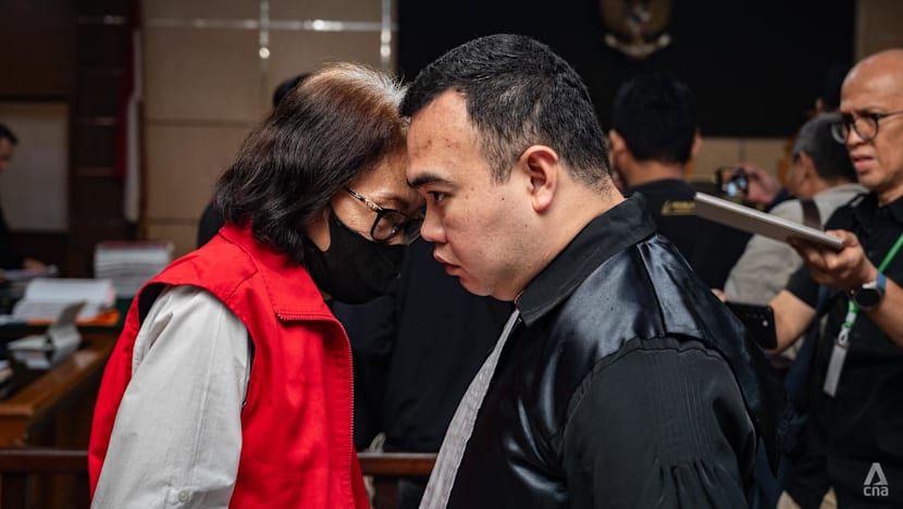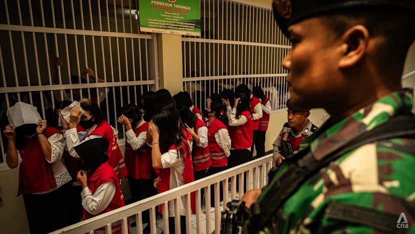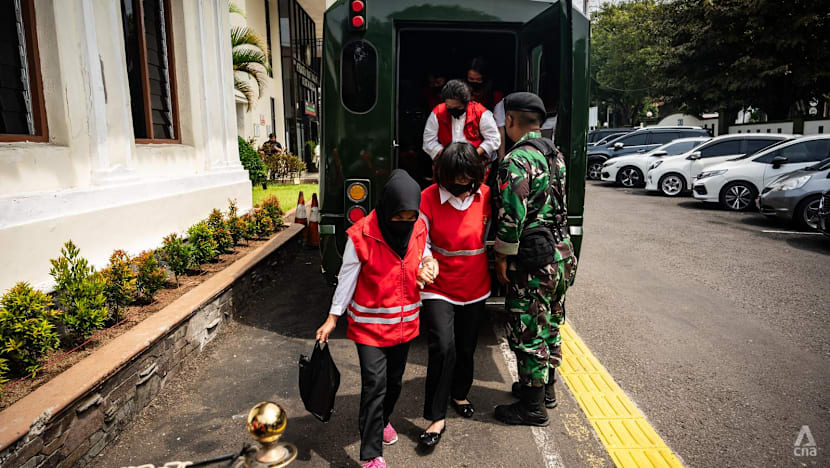 Defendants of a baby trafficking case being escorted out of their holding cells at the Bandung District Court, West Java on Apr 7, 2026. (Photo: CNA/Wisnu Agung Prasetyo)