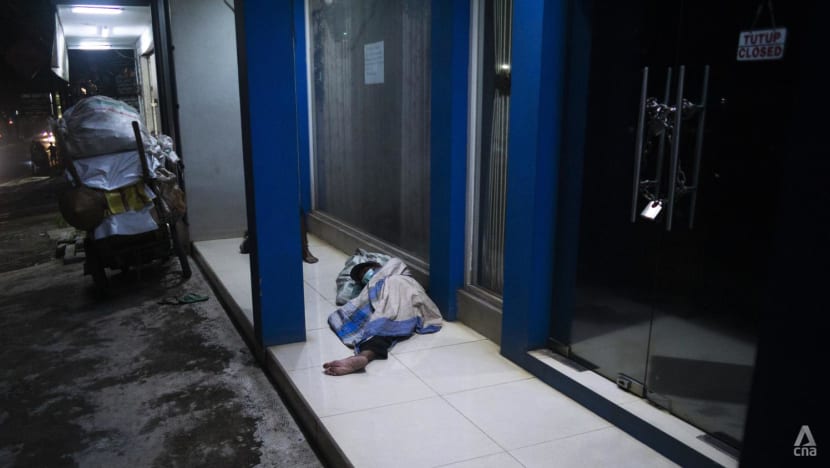 A homeless man sleeps in front of a closed department store in a commercial district in Jakarta, Indonesia. (Photo: CNA/Nivell Rayda)