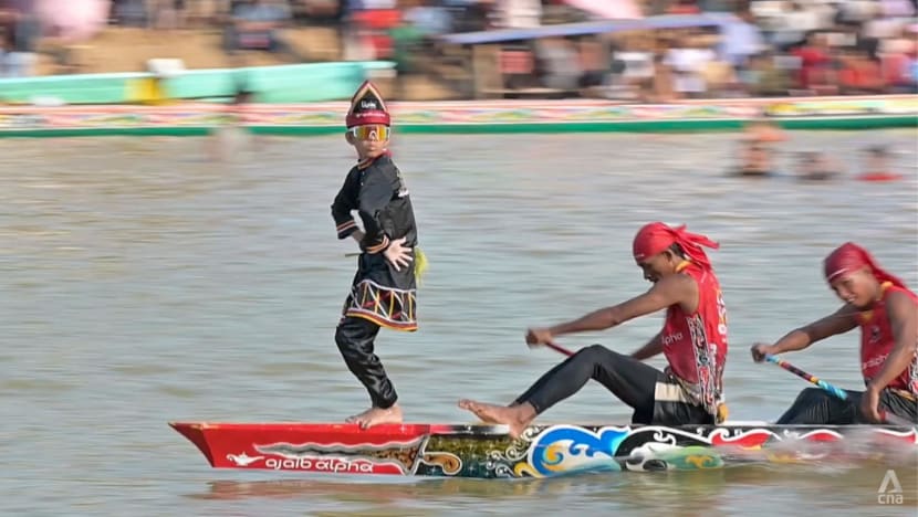 Rayyan Arkan Dhika, the internet sensation known for his dance performances at Riau's Pacu Jalur boat race, taking part in this year's race on Aug 21, 2025. (Photo: CNA/Yudhie)