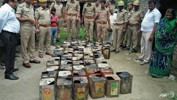 Indian police gather around containers of bootleg alcohol recovered in a raid in Uttar Pradesh state on Jul 11, 2017. (Photo: STR/AFP)
