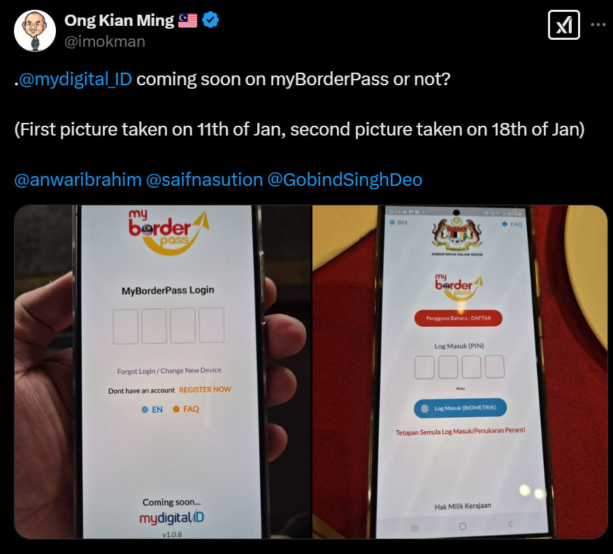 Academic Ong Kian Ming - who is pro vice-chancellor of external engagement at Taylor's University in Selangor - told CNA that when he initially downloaded the MyBorderPass app, there was a text at the bottom of the app indicating that it would be integrated with MyDigital ID.