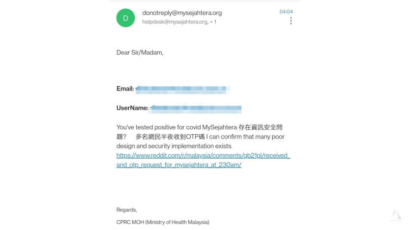 There were also complaints of spam emails from an account appeared to belong to MySejahtera.