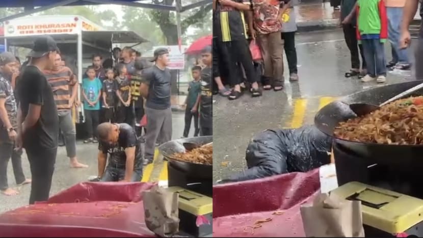 In the video, several people, including the vendor, responded by attacking him and pouring oily noodles on his head. One of them then kicked him as he was cleaning his face with rainwater.
