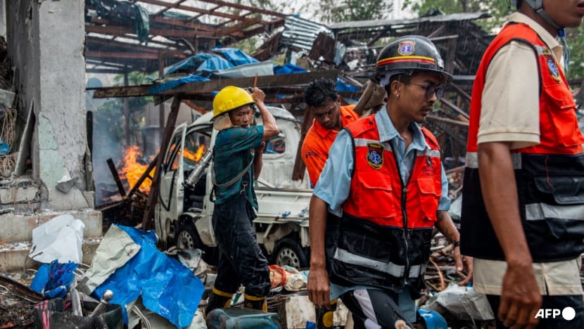 People extinguish a fire in a building that was destroyed in a bombardment carried out by Myanmar's military in Thabeikkyin Township in Mandalay Region of Central Myanmar on Apr 19, 2025. (File photo: AFP)