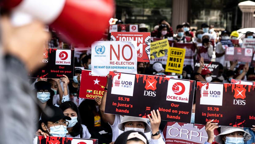 Protesters near the Singapore embassy in Yangon, Myanmar on Feb 26, 2021. (Photo: Naung Kham) ​​​​​​​