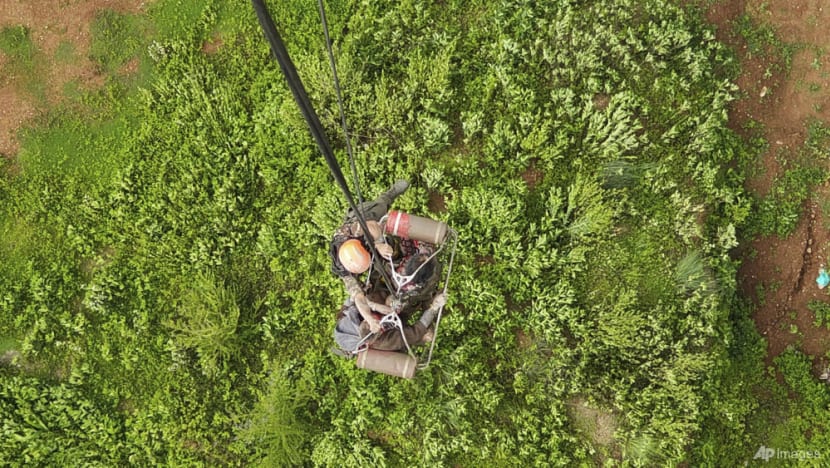 People observe the damage caused by flooding on the Bhotekoshi River 120km north of Kathmandu on Jul 8, 2025. (Photo: AP/Nepal Army)
