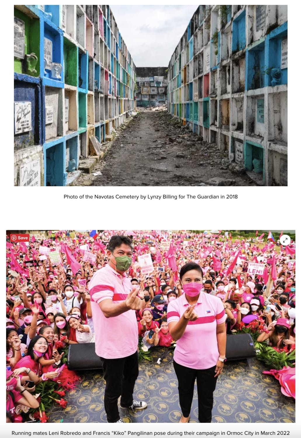 A reverse image search shows the original photograph of the pair was taken at their campaign in Ormoc City on Mar 29. As for the photograph of the cemetery, FactRakers reported it was taken by photographer Lynzy Billing on Mar 23, 2018 and published in an article in The Guardian.