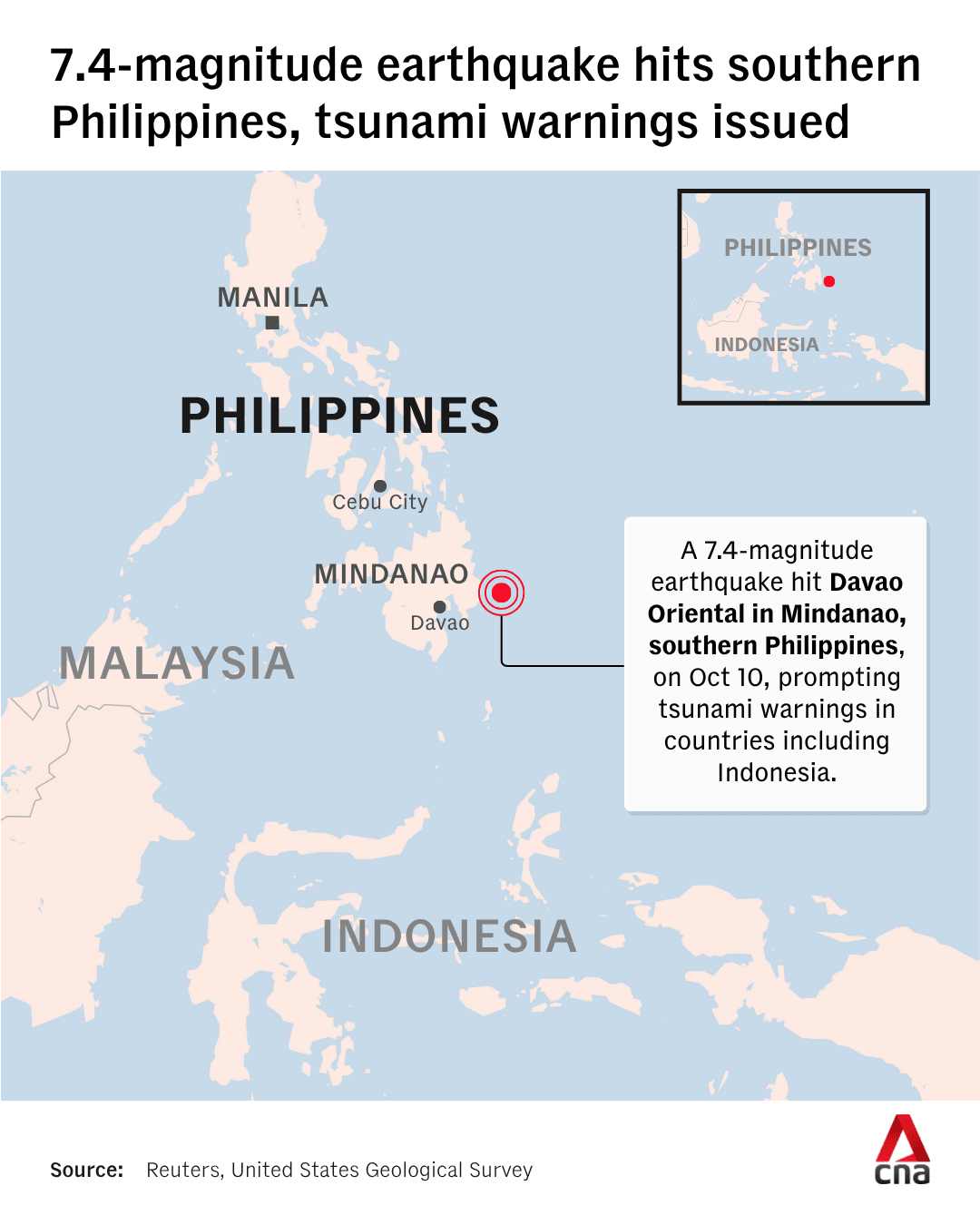MANILA: A strong earthquake of magnitude 7.4 struck offshore in the southern Philippines on Friday (Oct 10), the country's seismology agency said, with tsunami warnings issued in several countries and people in nearby coastal areas urged to move inland or to higher ground.