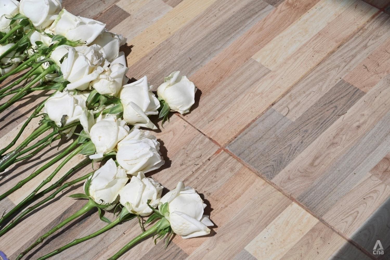 Bouquets of flowers placed outside the nursery, where the armed attack took place on Oct 6, 2022. (Photo: CNA/Pichayada Promchertchoo)