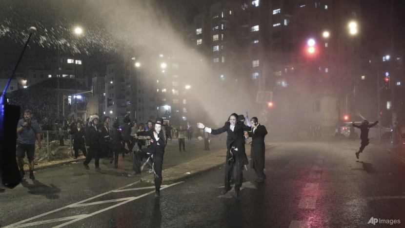 Israeli police said protesters threw rocks and attacked the car of an ultra-Orthodox Cabinet minister, pelting it with stones. Water cannons filled with skunk-scented water and police mounted on horses were used to disperse the crowd. But the demonstration was still not under control late Sunday.