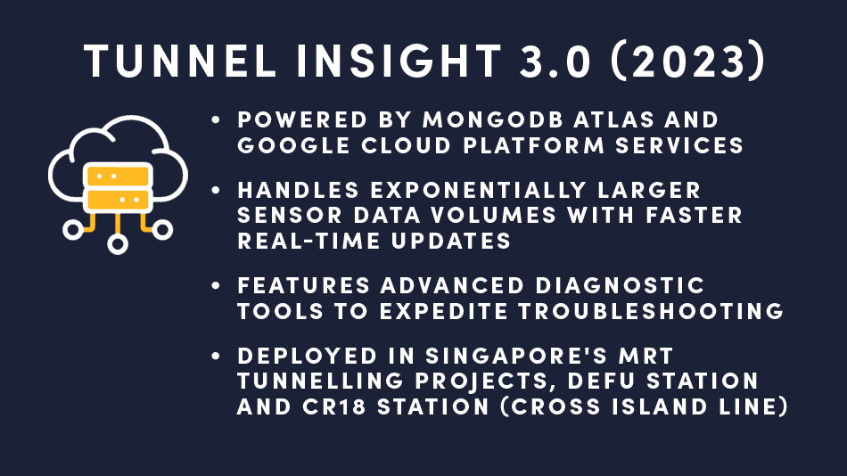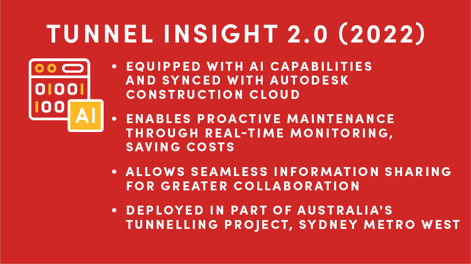 Tunnel Insight 1.0, which focused on data visualisation and automated diagnostics, was first used in 2019 in the construction of the MRT Putrajaya Line in Malaysia. Since then, newer iterations have been developed by an expanded team of in-house engineers. Tunnel Insight 2.0 and Tunnel Insight 3.0, launched in 2022 and 2023, respectively, contain updates to enhance the user experience and have been deployed in tunnelling projects in other countries.