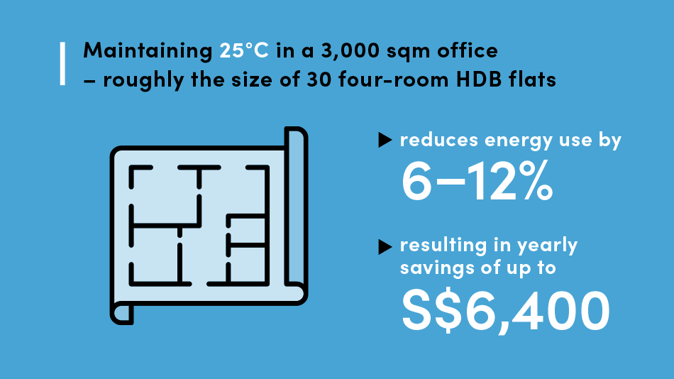 A temperature setting of 25°C is a widely recognised benchmark for thermal comfort, supported by international research and standards. When paired with hybrid cooling methods like fans, 25°C can feel as cool as 23°C, while using significantly less energy and lowering operating costs. Raising the setpoint to 25°C also supports Singapore’s broader push towards climate resilience.