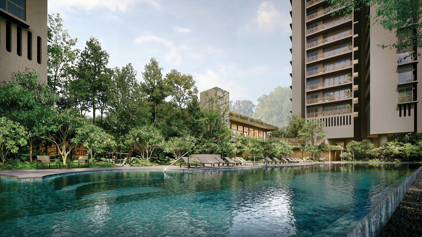At the base of the twin towers, lush landscaping frames the swimming pool, alongside pockets for reading or reflection and outdoor spaces suited to casual gatherings.