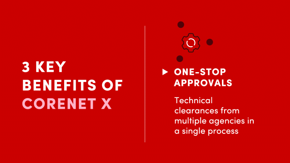 - Co-led by the Building and Construction Authority of Singapore (BCA) and the Urban Redevelopment Authority (URA) with support from the Government Technology Agency of Singapore (GovTech), Corenet X transforms regulatory processes for building works.