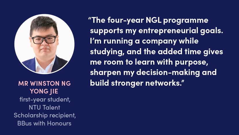 Mr Chong is enrolled in Nanyang Technological University’s (NTU) double-degree programme in accountancy and business and is part of the Nanyang Global Leaders (NGL) programme – NBS’ flagship pathway for top students, launched in 2025.