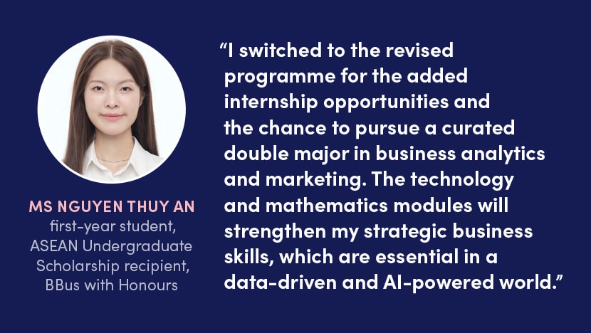 The purpose-built curriculum aims to set NBS apart from other four-year business programmes through its emphasis on industry relevance and more personalised pathways. Associate Professor Angie Low, associate dean of undergraduate education at NBS, oversees the redesign.