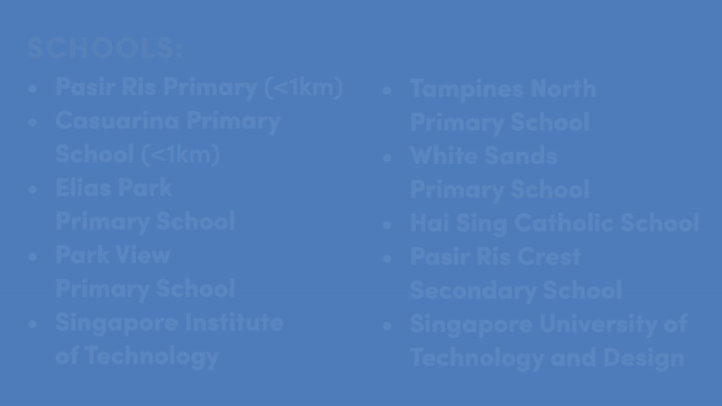 The town is anchored by three malls – White Sands, Pasir Ris Mall and Downtown East – that cover everything from daily essentials to weekend entertainment. There’s also a strong network of educational institutions, with six primary and two secondary schools serving the area.