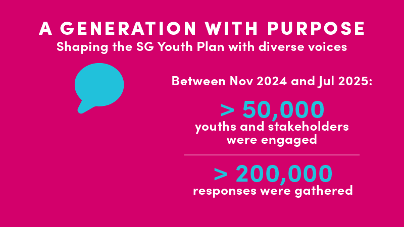 Between November 2024 and July 2025, the SG Youth Plan engaged more than 50,000 youths and stakeholders, gathering over 200,000 sentiments. The conversations revealed a generation that is pragmatic yet purposeful, values non-traditional success and seeks more ways to contribute meaningfully to the community.