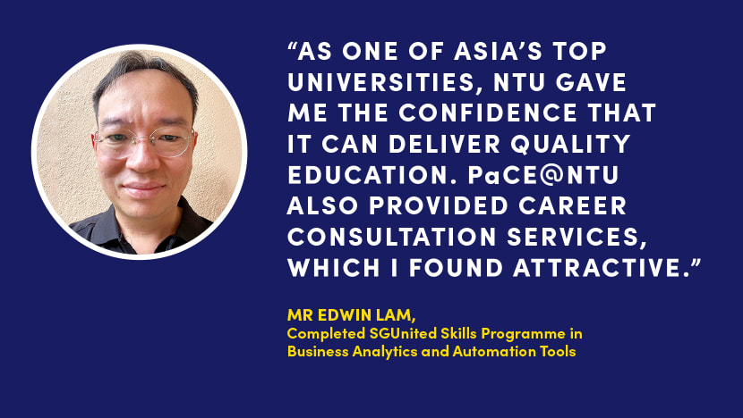 For Mr Gary Yeo, a systematic quant trader and a self-professed lifelong learner who completed the SGUS Programme in Business Analytics and Automation Tools, keeping abreast of the latest developments in technology was a key benefit of the programme. He also appreciated how the career services team was available to guide learners in making a career switch.