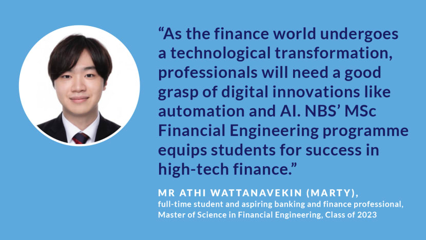 The robust curriculum at NBS focuses on new and globally relevant technologies, with postgraduate programmes on digital transformation, AI and blockchain technology, among others. The school also leverages NTU’s broad ecosystem of expertise, and co-designs and co-teaches programmes like the Master of Science in Financial Engineering with faculty from NTU’s School of Physical and Mathematical Sciences.