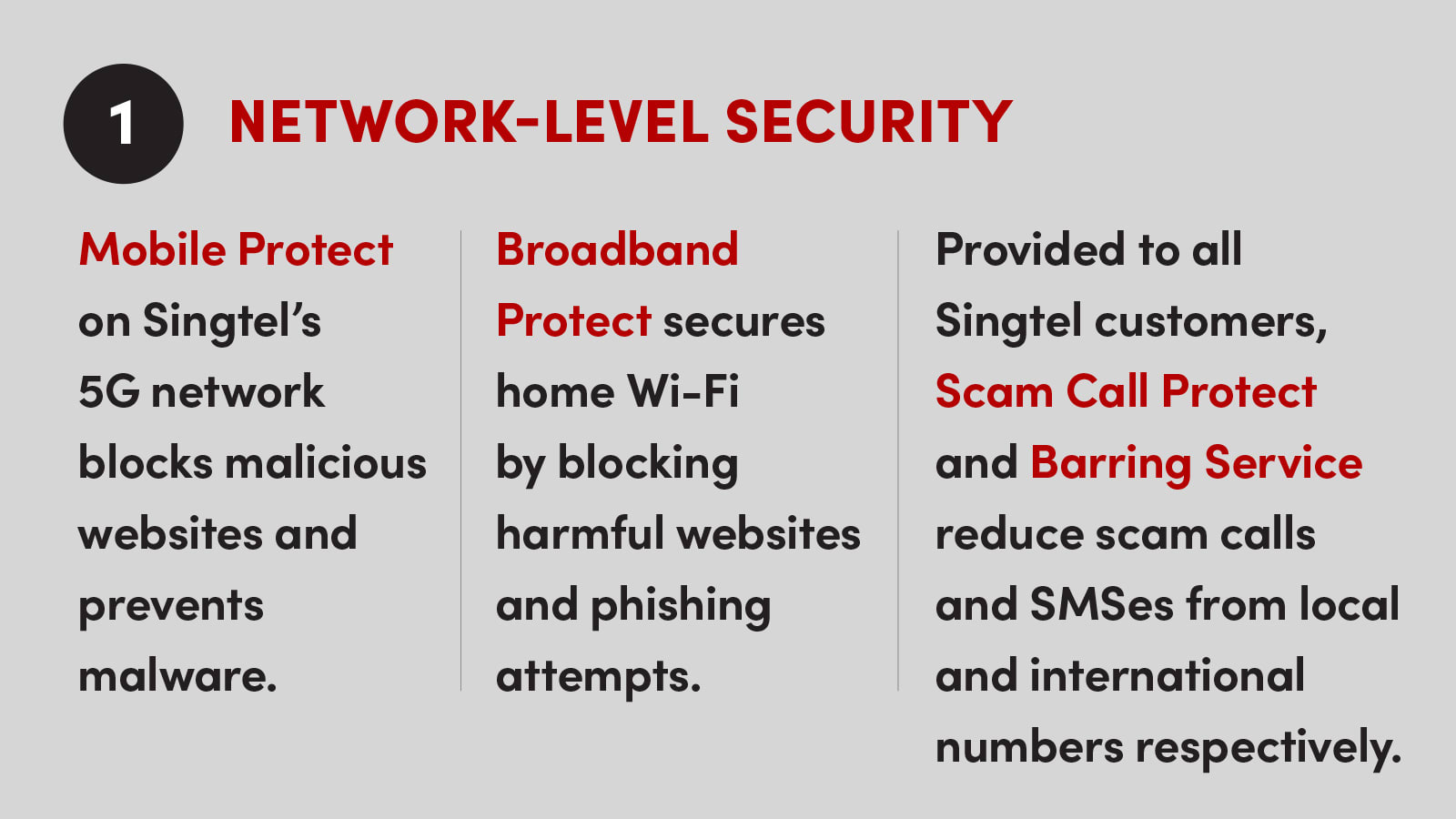To counter such threats, Singtel unveiled its 3-Step Security Approach in February 2023. This robust strategy strengthens the foundational security in its products and services with network, device-level and community-driven vigilance. By implementing added security measures, Singtel aims to bolster defences against emerging cyber threats and stay one step ahead of scammers