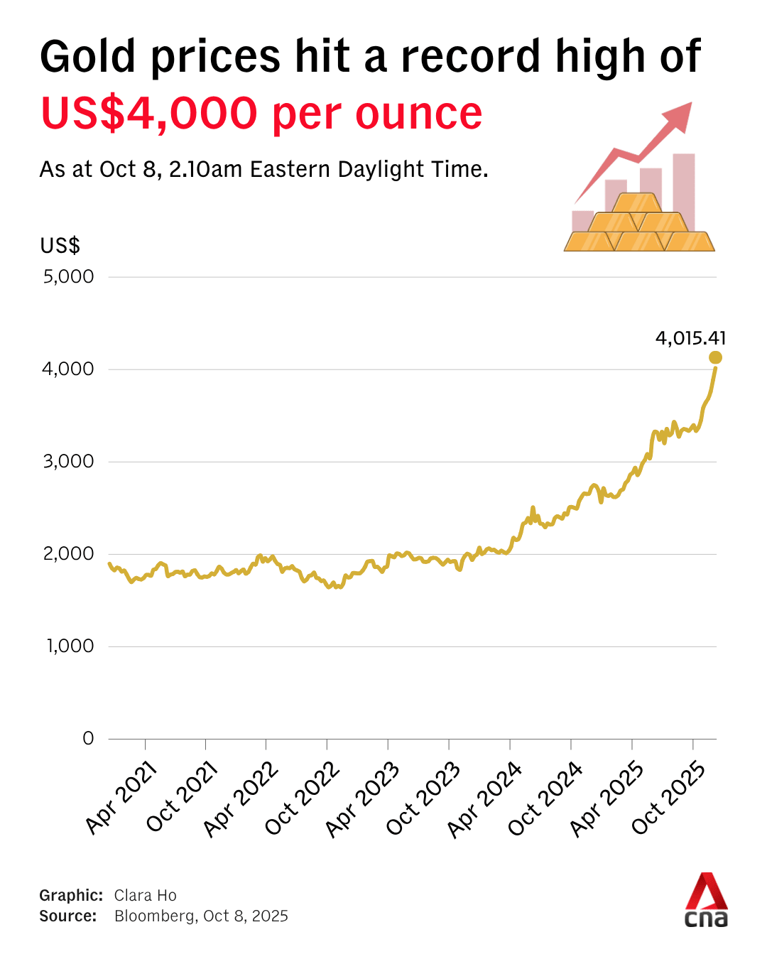 Gold pushed through US$4,000 an ounce to hit a record on Wednesday (Oct 8), driven by investors seeking safety from mounting economic and geopolitical uncertainty, alongside expectations of further interest rate cuts by the United States Federal Reserve.