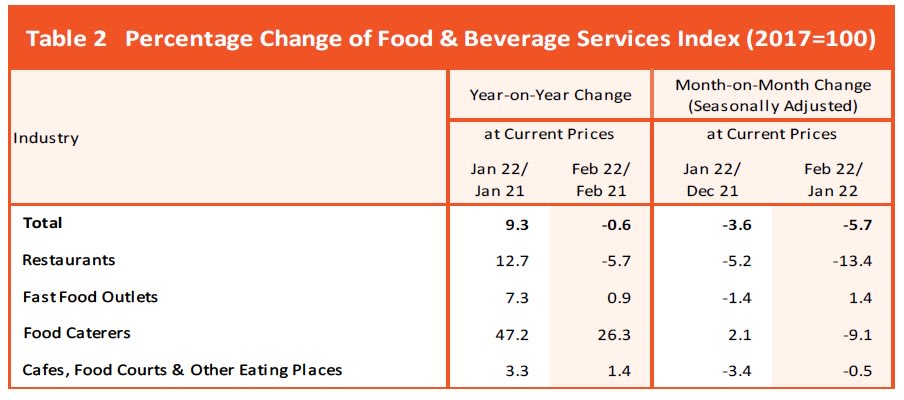 Meanwhile, food caterers saw an increase in sales of 26.3 per cent due to the low base in the same period in 2021, when demand for catering was low.