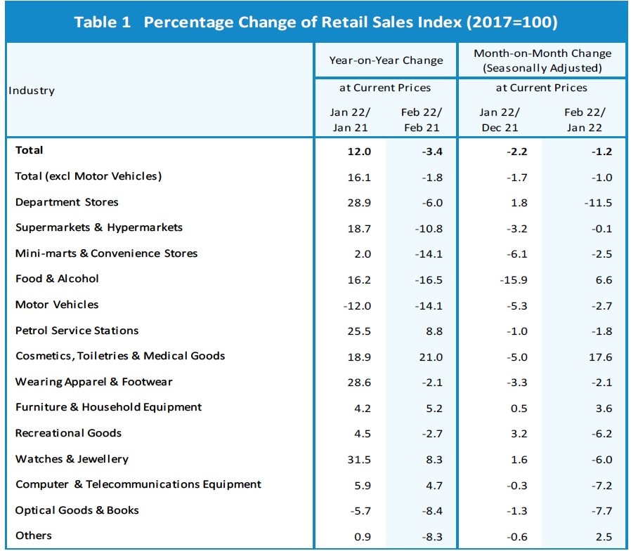 This is partly attributed to lower sales in February compared to the same period last year when sales were boosted by spending prior to Chinese New Year, according to data released by the Singapore Department of Statistics (SingStat) on Tuesday (Apr 5).