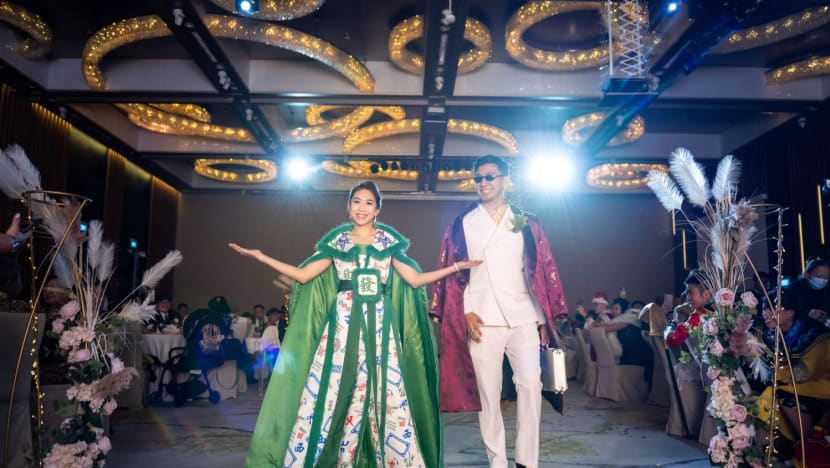 Kathy, who is Chinese, wore a dress with mahjong prints, while Sanee — whose mother is of Indian and Malay descent, while his father is Chinese — wore a sherwani, or long coat, and carried a suitcase à la God of Gamblers.