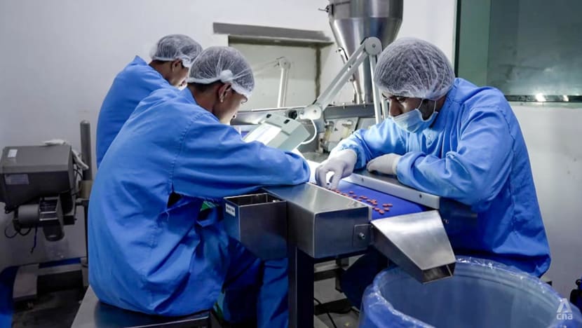 Workers carrying out quality control checks on pills in an Indian pharmaceutical manufacturing firm.