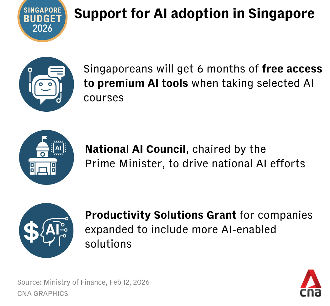 The Budget also includes measures to spur adoption, including six months of free access to premium AI tools for Singaporeans who take up selected courses, alongside productivity support for firms.