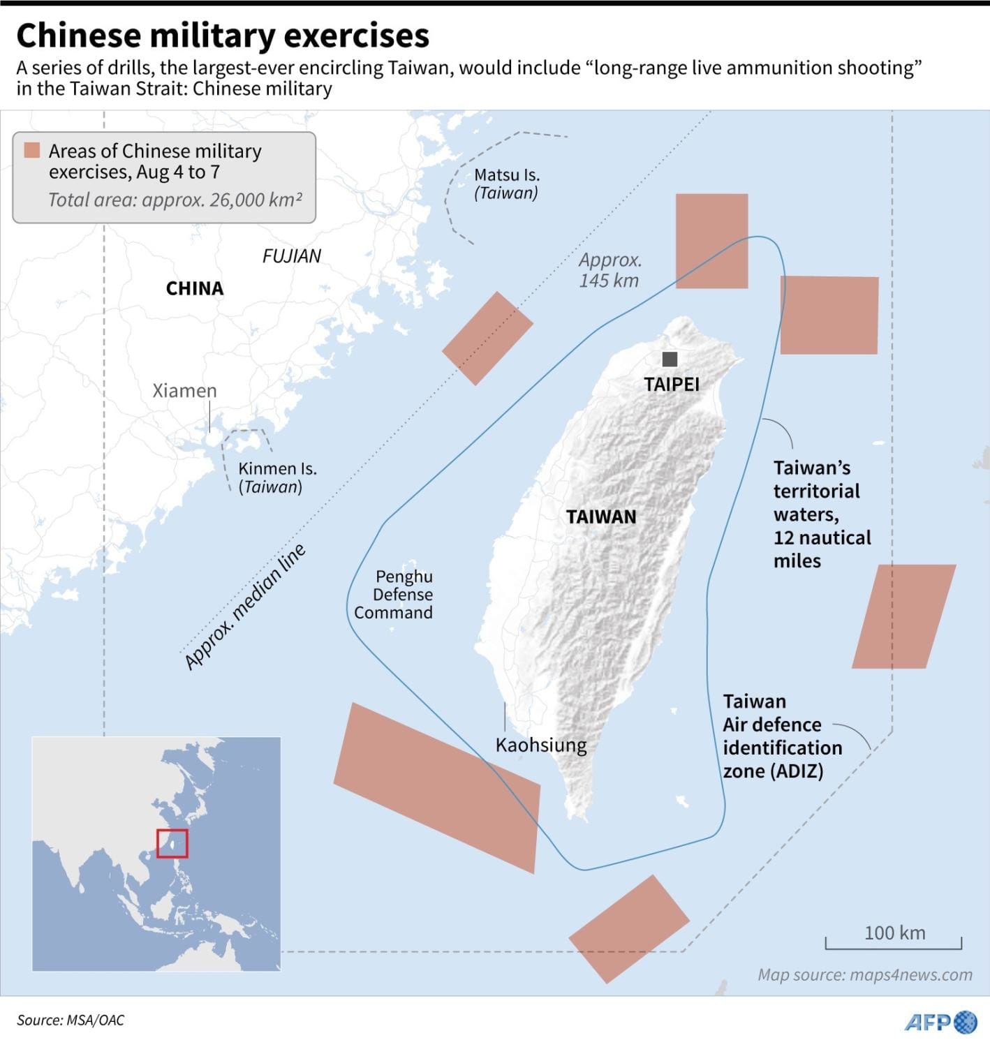 The closest of these is a mere 9 nautical miles (16.7km) from Taiwan’s southwestern coast not far from the port city of Kaohsiung, while two other gazetted areas off the northern Taiwan are 10nm and 12nm (18.5km and 22.2km) at their closest point to the coast respectively.