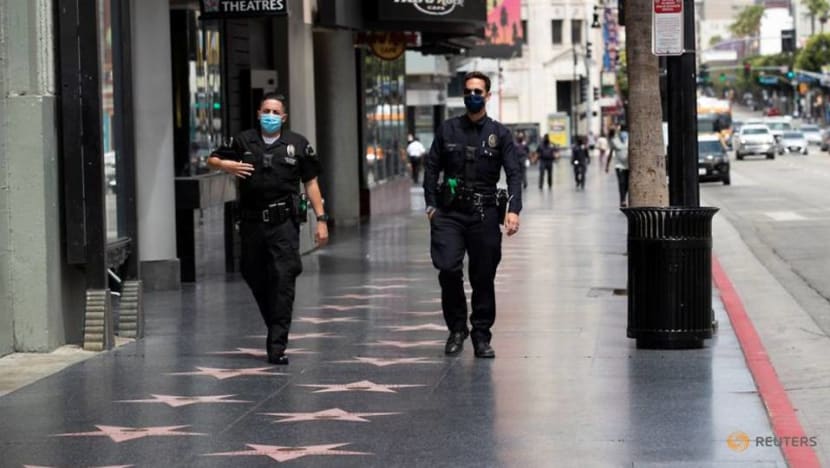 LAPD Officers wear face masks as they patrol Hollywood Blvd during the outbreak of the coronavirus disease (COVID-19), in Los Angeles, California, U.S., May 18, 2020. REUTERS/Mario Anzuoni