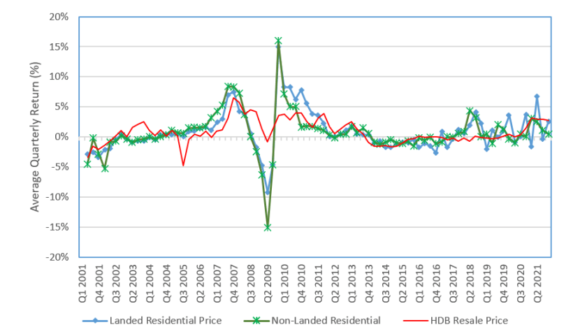 During this period, the resale public housing prices grew at 0.82 per cent per quarter on average, or an accumulated growth of nearly 70 per cent. Private landed, and non-landed residential property price indices have increased by 71.5 per cent and 58.0 per cent, respectively in this same time.