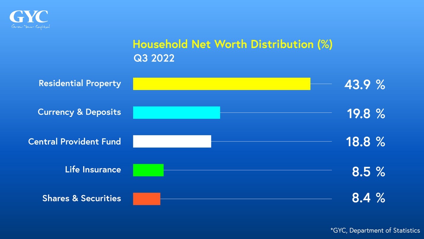 The latest Singapore household sector balance sheet shows how an average household’s wealth is spread. Unsurprisingly, property formed the largest chunk (43.9 per cent) by virtue of property being one of the largest purchases by Singaporeans. The next two biggest holdings are deposits and CPF (19.8 per cent and 18.8 per cent. Shares and securities form the smallest allocation at 8.4 per cent.