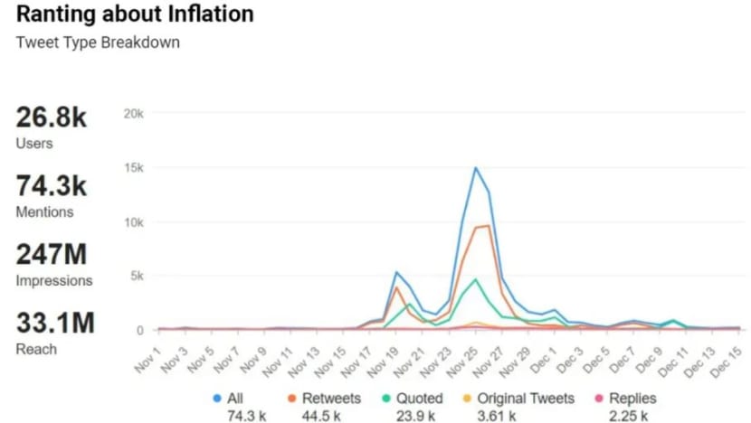 There was a spike in the number of mentions about inflation from Nov 23 to 27, 2021. This was partly due to government and news reports about the exponential rise in prices of daily necessities.