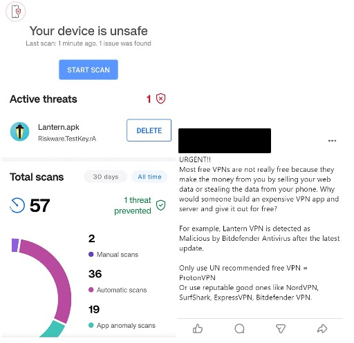 For example, the image below is a post shared on a Facebook page called Free VPN in Myanmar, flagging the risks of free VPNs. Unfortunately, it is overshadowed by more posts advertising free and paid VPNs that are still working in Myanmar.
