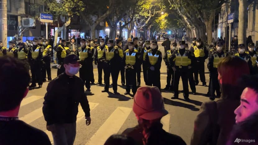 Police and people are seen during some clashes in Shanghai on Nov 27, 2022, where protests against China's zero-COVID policy took place the night before following a deadly fire in Urumqi, the capital of the Xinjiang region. (Photo: AFP/Hector Retamal)