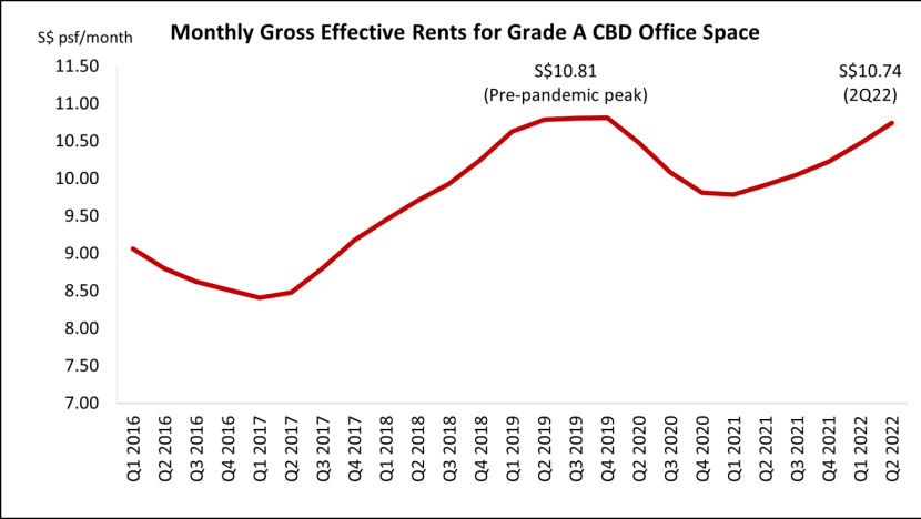 As a result, even with new completions, the growth in CBD office inventory has fallen behind that of demand. This has provided the stage for rents to climb.For Grade A office spaces in the CBD, the average monthly gross effective rents have been rising at an accelerated pace every quarter since bottoming out in early 2021. By the second quarter of 2022, they had recovered to reach S$10.74 per sq ft, just slightly below their pre-pandemic peak of S$10.81 per sq ft in the fourth quarter of 2019.
