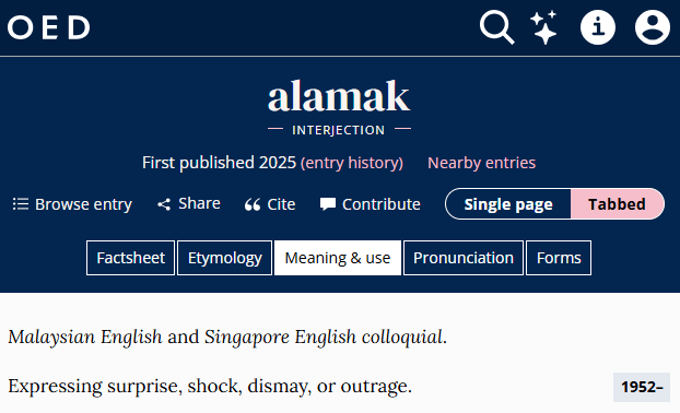 Even the Oxford English Dictionary seems to have made up its mind: It has been adding expressions used in Singapore and Malaysia, like “lepak”, “blur” and “shiok”. In March, “alamak”, “tapau” and others were included. Oxford noted that borrowing “untranslatable words” from other languages fills a lexical gap and that loan words sometimes become part of a speaker’s variety of English.
