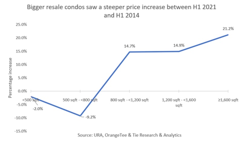 Over the last seven years, the median price of large resale condominiums larger than 1,200 sqft rose between 14.9 and 21.2 per cent from H1 2014 to H1 2021, a stark difference from smaller units below 800 sqft which saw a 2 to 9.2 per cent decrease.