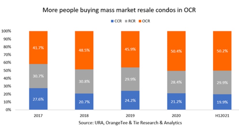 More buyers have their eye on suburban areas, where bigger homes may come with a more affordable price tag in the resale market. About 50 per cent of non-landed resale transactions in the first half of 2021 were in the OCR, up from 45.9 per cent in 2019 and 41.7 per cent in 2017.